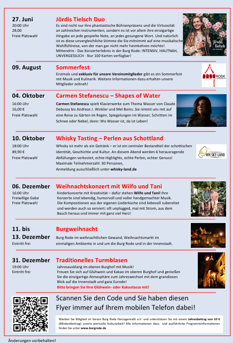 Ab sofort können Burgführungen vereinbart werden, die Kosten für eine Burgführung betragen für Schulklassen der Herzogenrather Schulen pauschal 20 € (für maximal 25 Teilnehmer) und für allen anderen Gruppen pauschal 60 € (für maximal 25 Teilnehmer). Anfragen per Mail an geschaeftsfuehrer@burgrode.de